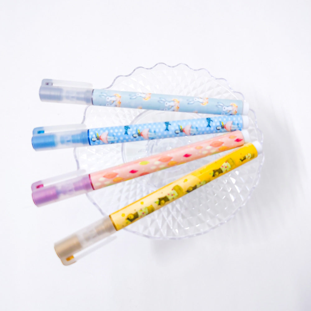 グレー・イエロー・ピンク・ブルーの4色がセットになっています。ボディにはウサギや猫が描かれています。