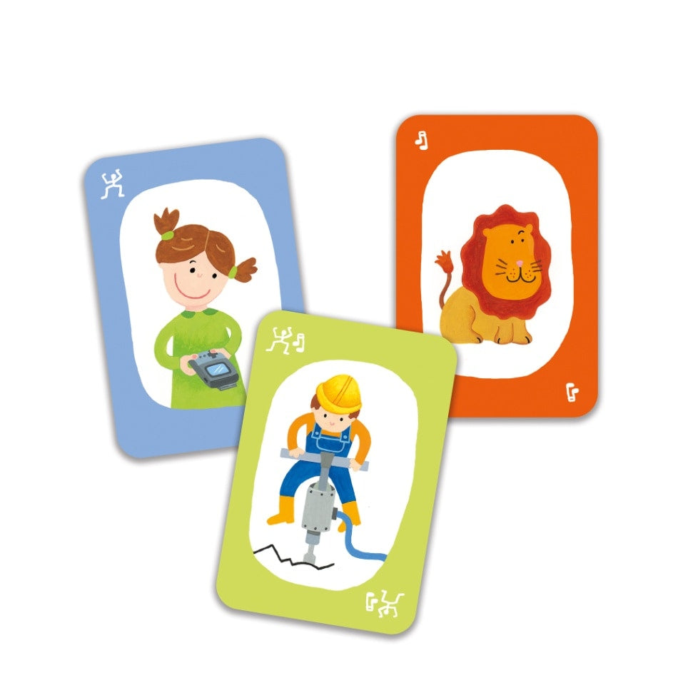 音まねやジェスチャーをして、カードに描かれている絵を当てるゲームです。
