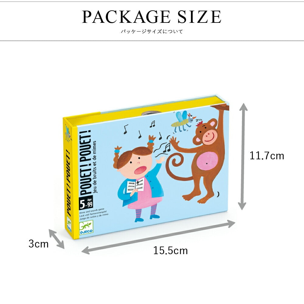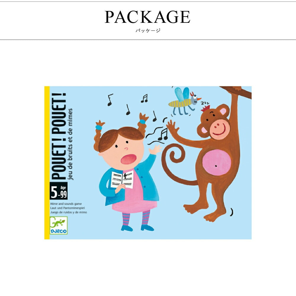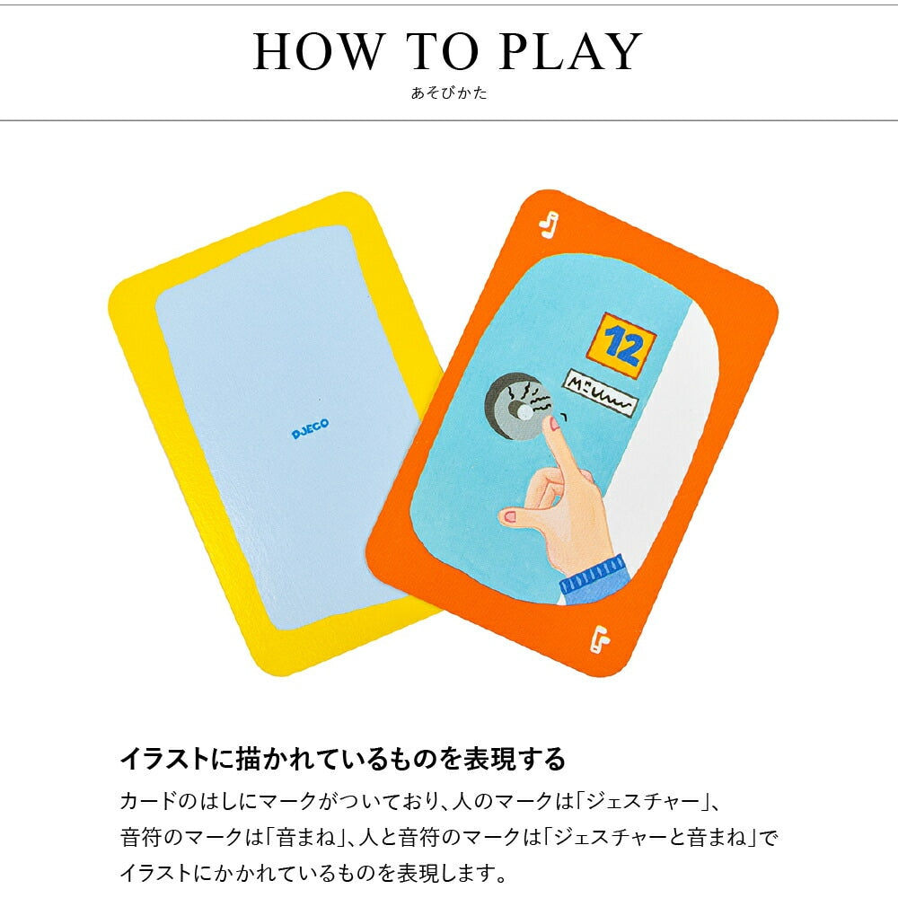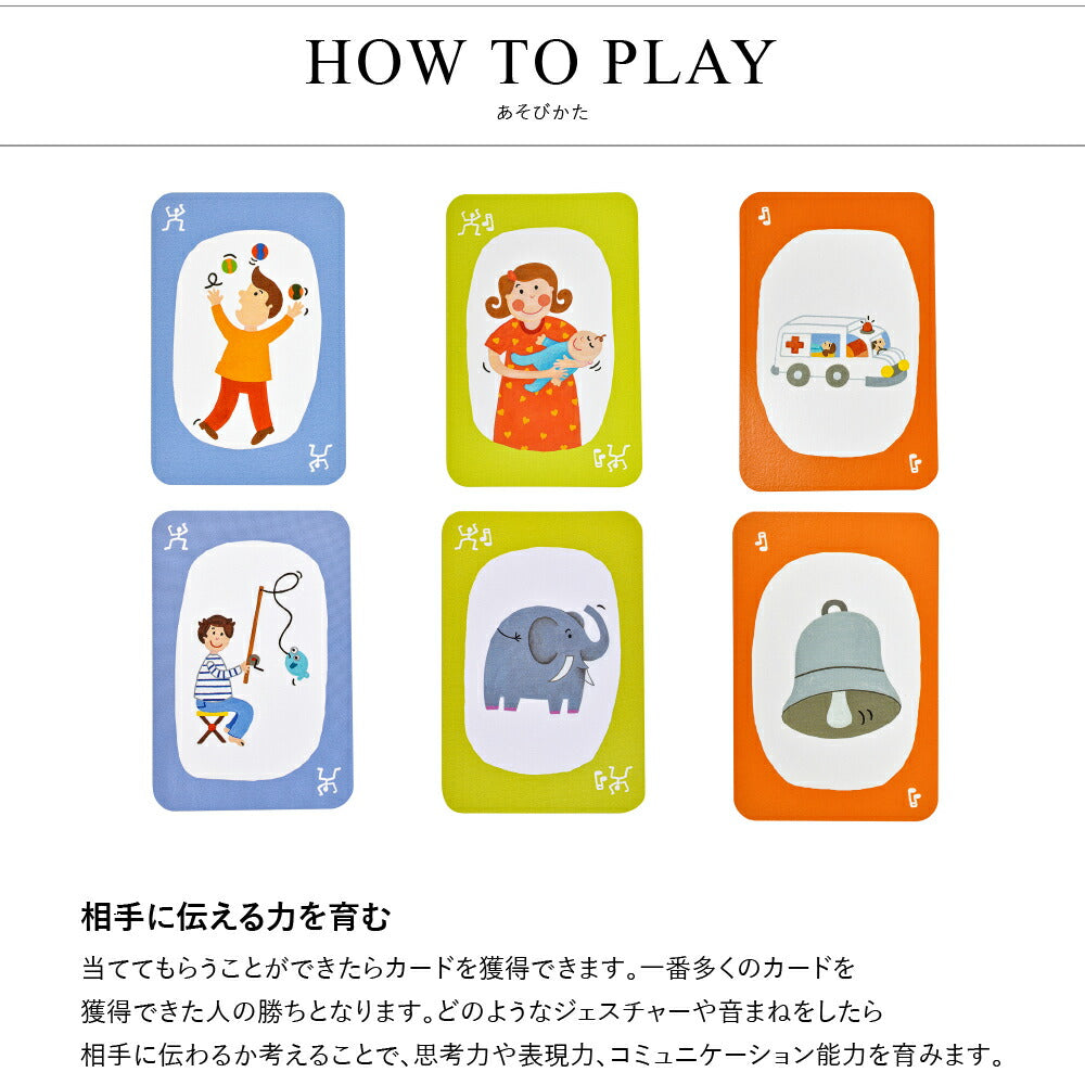 山札からカードを1枚とり、そのカードに描かれた絵を表現し、他の人に当ててもらいます。一番多く当ててもらった人が勝ち。