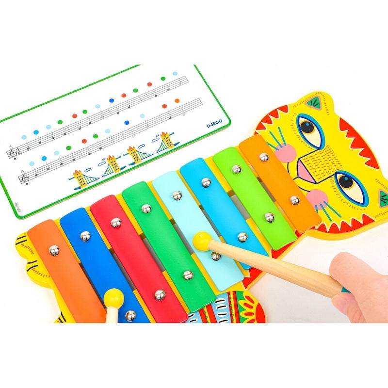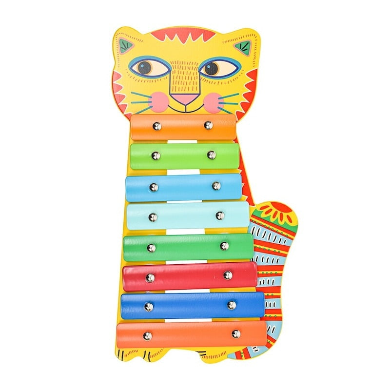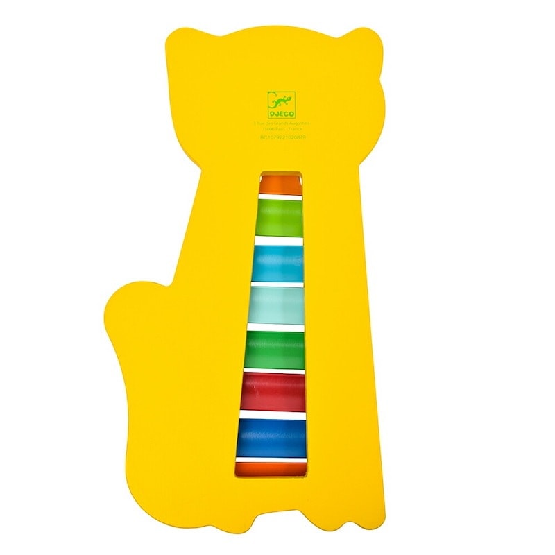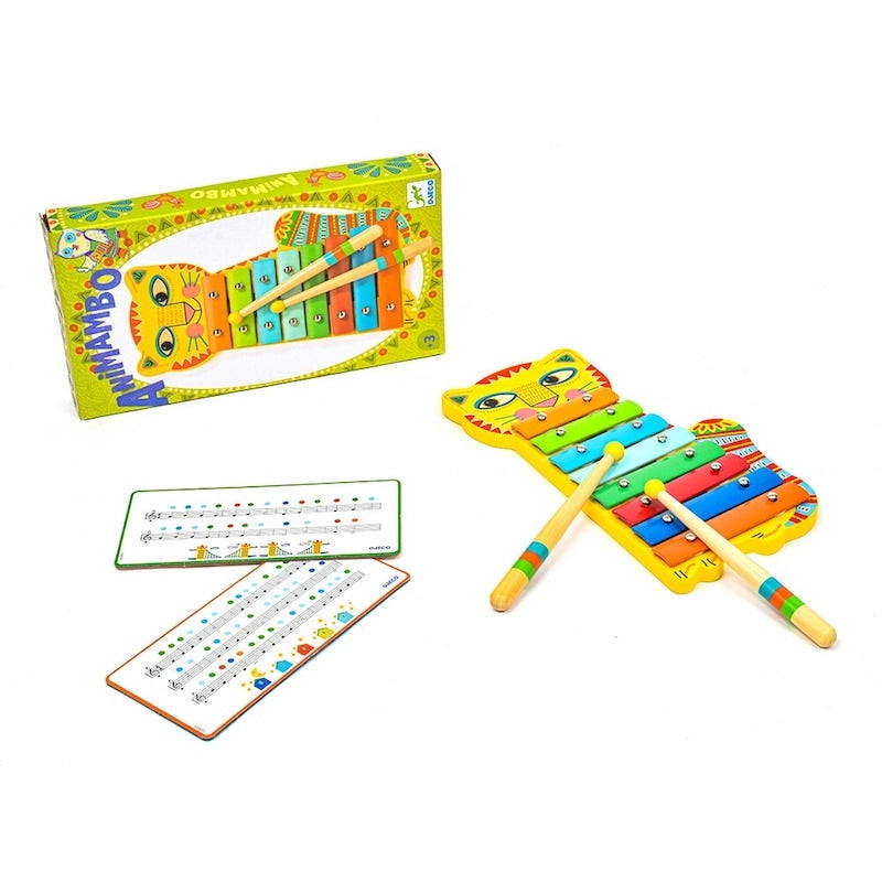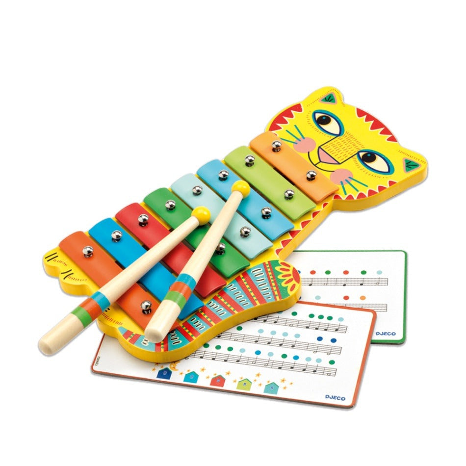 ユニークなネコが特徴的な子どもサイズの鉄琴。鮮やかな色合いが目を引きます。2枚の楽譜が付属します。