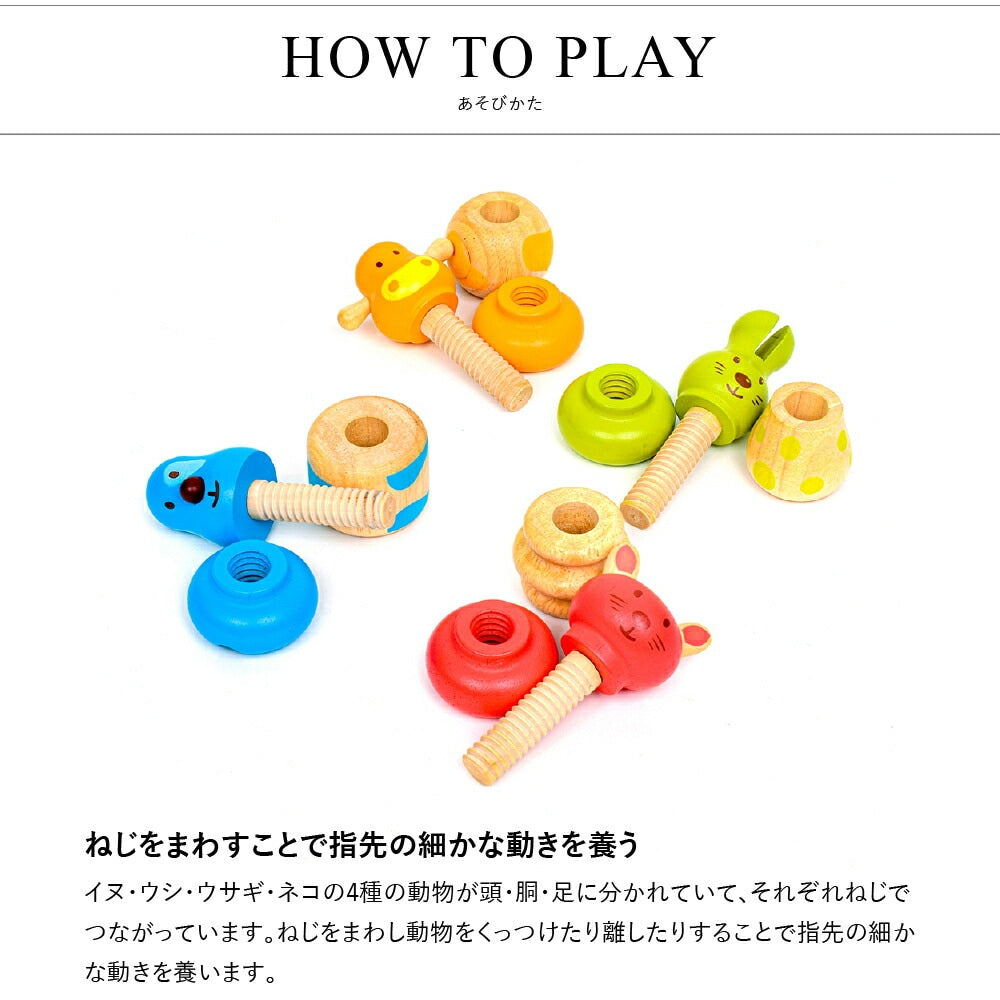 動物それぞれの頭と胴体の形が異なります。ひねる動作がまだ難しいと感じたら、握ったり触ったりすることから楽しみましょう。