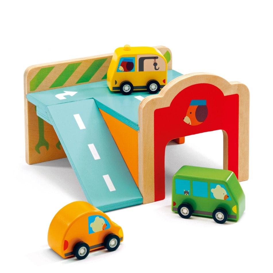 車をガレージにくぐらせたり、スロープを走らせて見ましょう。